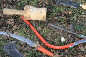 T is for tools. You need a rake, a pair of loppers, a saw, a billhook or axe, and a mallet.